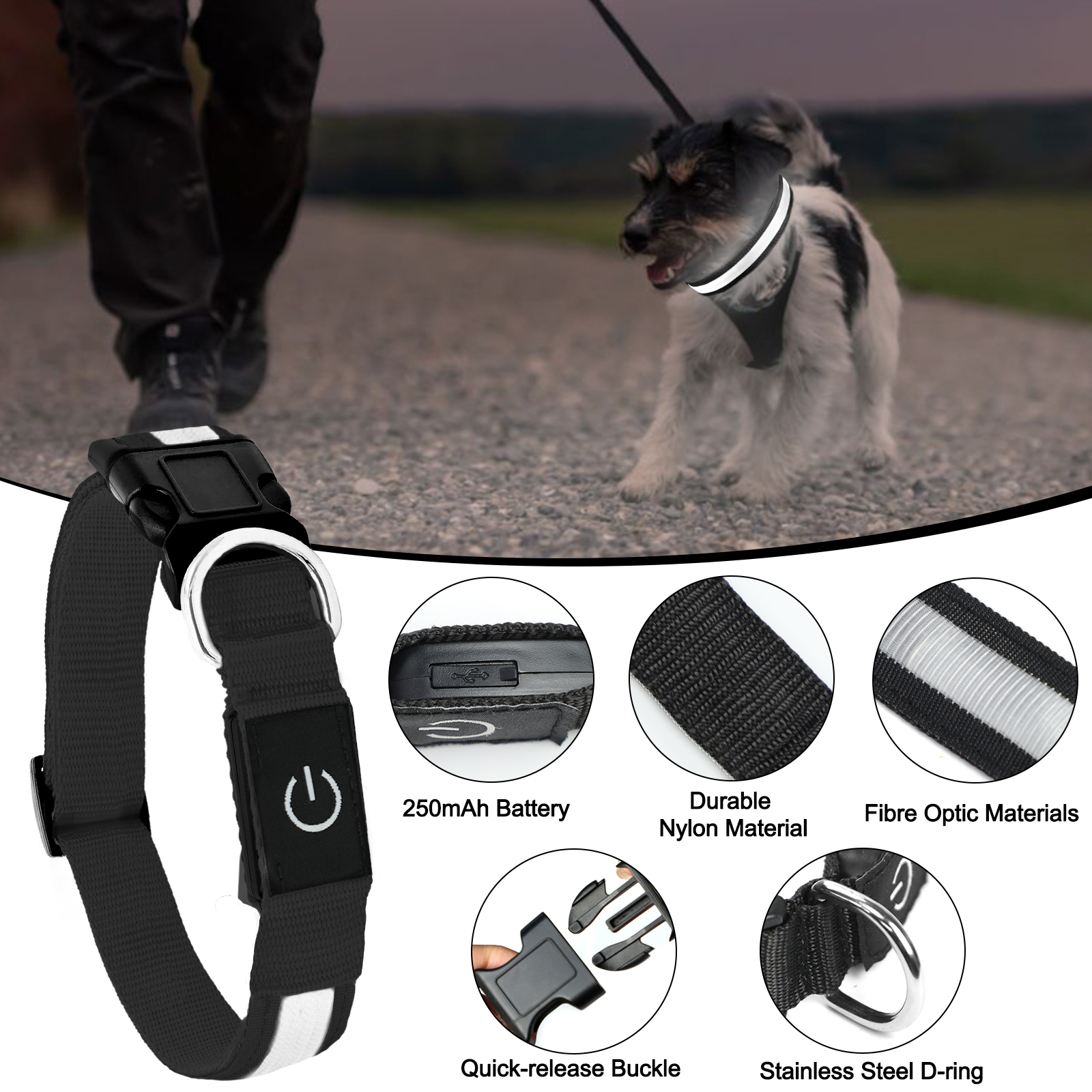 - COMFY & PRACTICAL FLASHING DOG COLLAR : Our light up collars are made of durable nylon material and high quality fibre optics for durability. Day or night, our flashing dog collars are up to the task and make the perfect gift for pets and pet owners. Package includes a light up collar and a charging cable. If you have any questions about our LED dog collar, please feel free to contact us and we will get back to you within 24 hours.